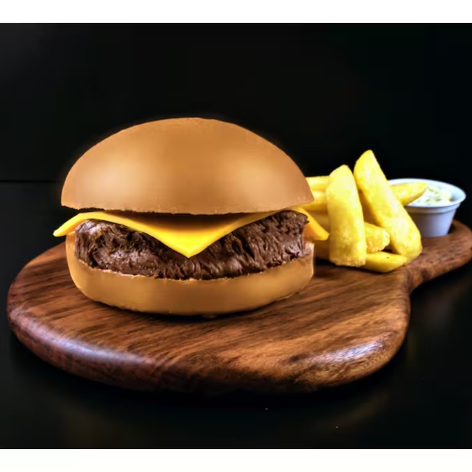 Pão de brioche, hamburguer 100gr, queijo, alface e tomate.