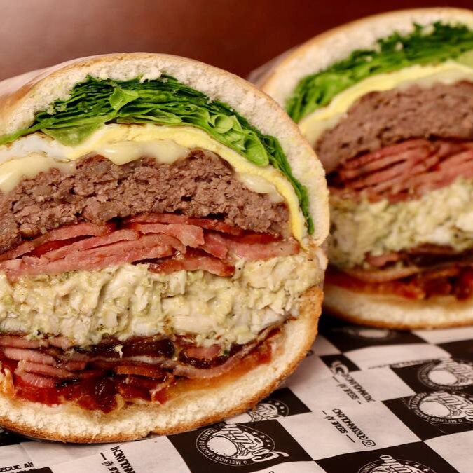 Pão de hambúrguer, dois burgers artesanal de 150g cada, dois ovos, queijo mussarela, tomate, alface e maionese.