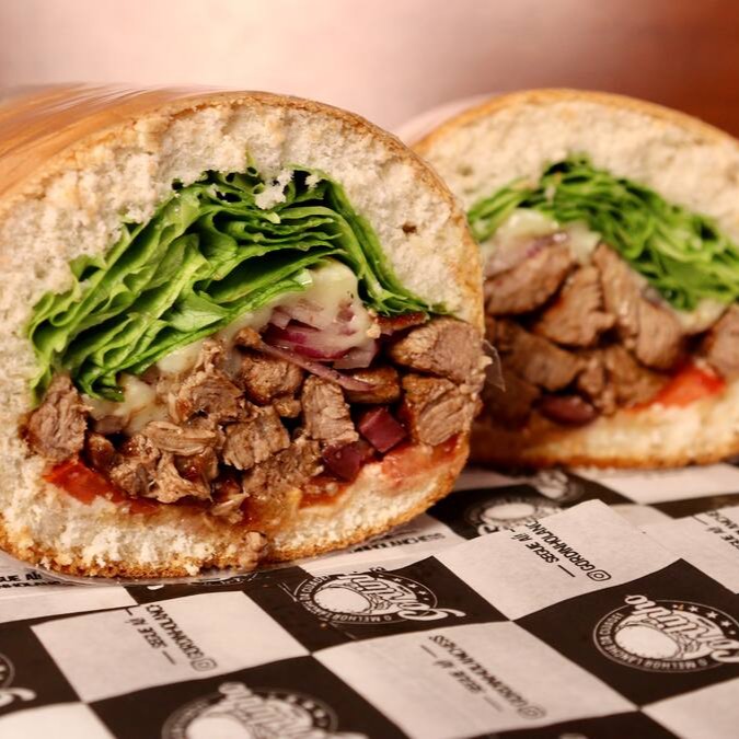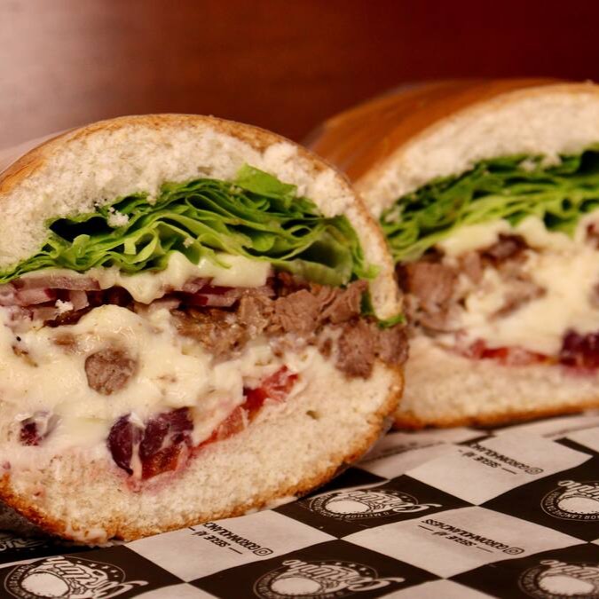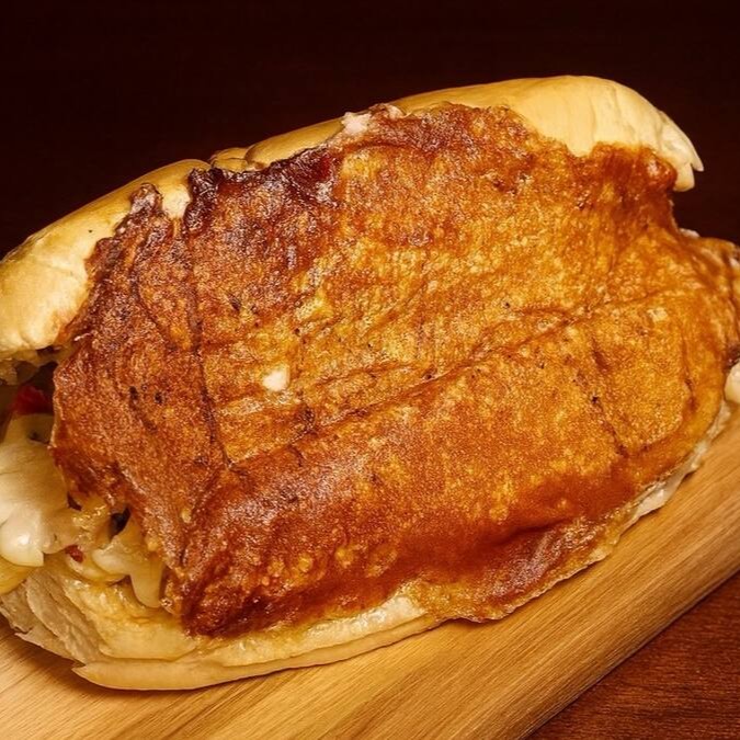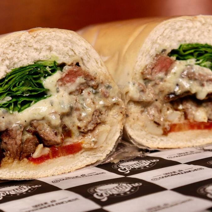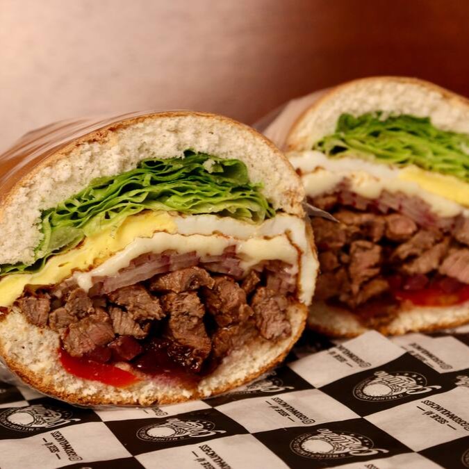 Pão de Hambúrguer ou Francês, Maionese, Tomate, Alface, ou Rucula, Azeitonas Pretas, Filé mignon em tiras (180g), Refogados com Alho e Cebola Roxa, e Queijo Mussarela.
