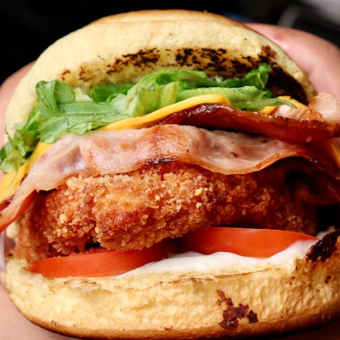 Pão Brioche, Maionese, Tomate, Frango empanado, Bacon, Cheddar, Molho especial, e Alface Picado