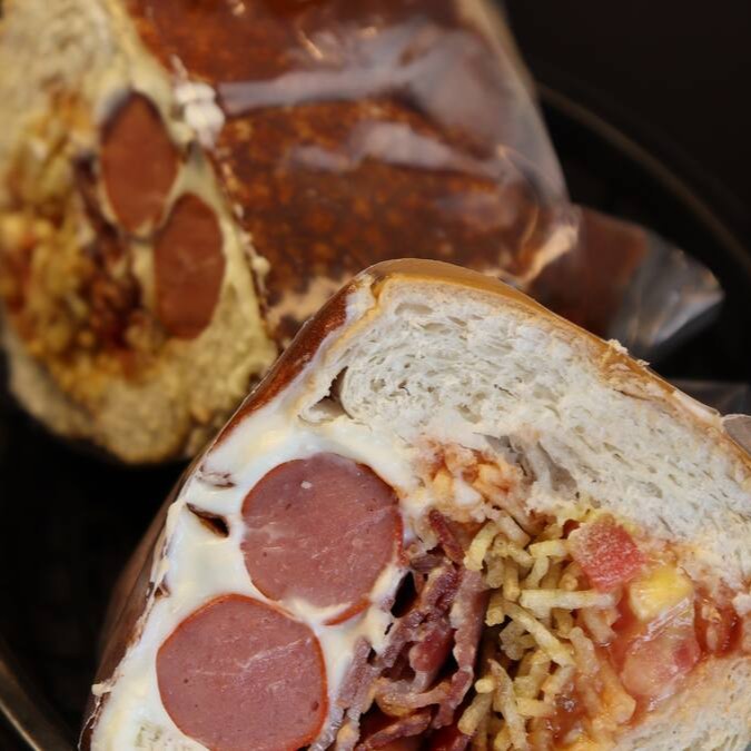 Pão de Hambúrguer ou francês, calabresa fatiada, bacon em fatias, queijo mussarela, tomate, alface e maionese.