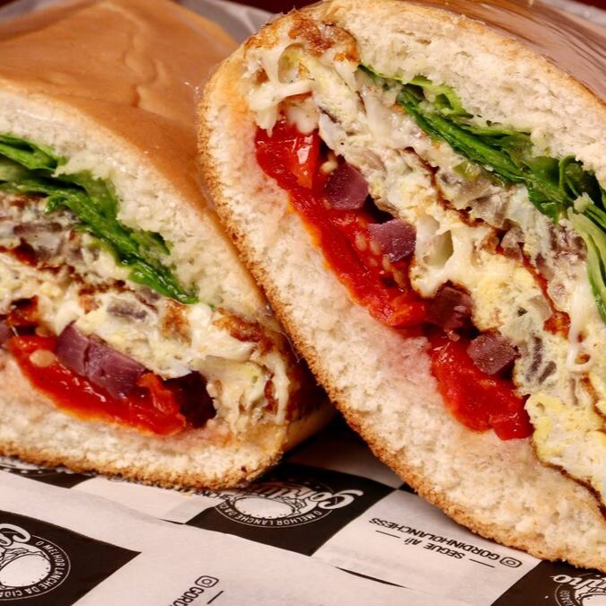 Pão de Hambúrguer ou Frances, Tomate Seco, Alface ou Rucula, Azeitona Preta, Ovos Batidos com Cebola e Queijo Mussarela.