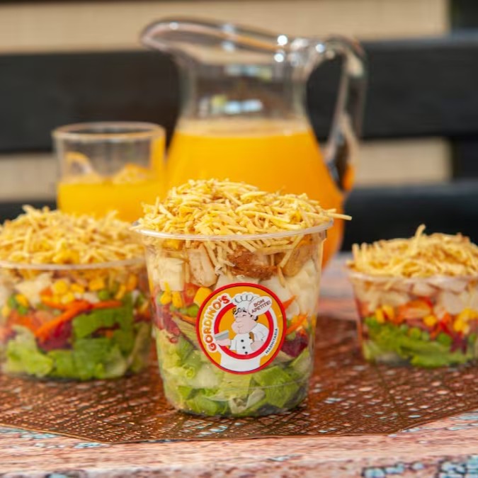 Alface, cenoura, beterraba, palmito, mussarela, milho, ervilha, PROTEÍNA, croutons, batata palha, tomate e molho rosê