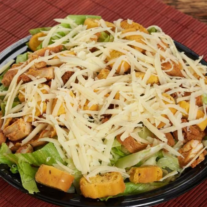 Alface americana, frango em cubos, croutons, parmesão ralada e molho.
