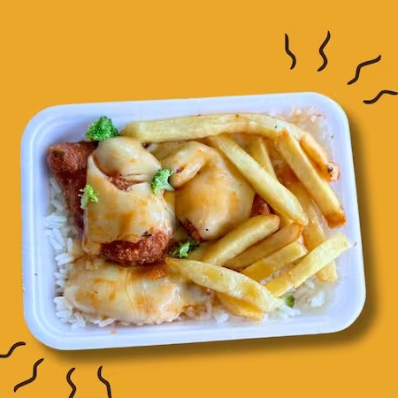 Acompanha Arroz+ Feijão + Parmegiana de frango c/ Fritas +Saladinha do Dia