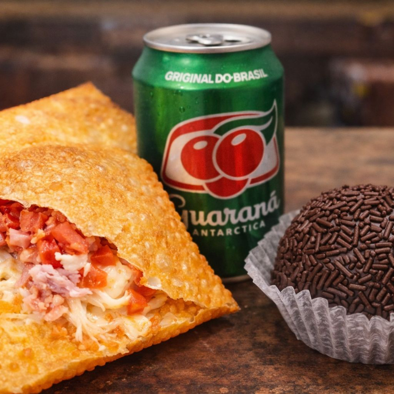 composto por um pastel de Pizza (Presunto mussarela e tomate em rodelas) Guaraná Antarctica lata 350ml, Brigadeirão de leite moça