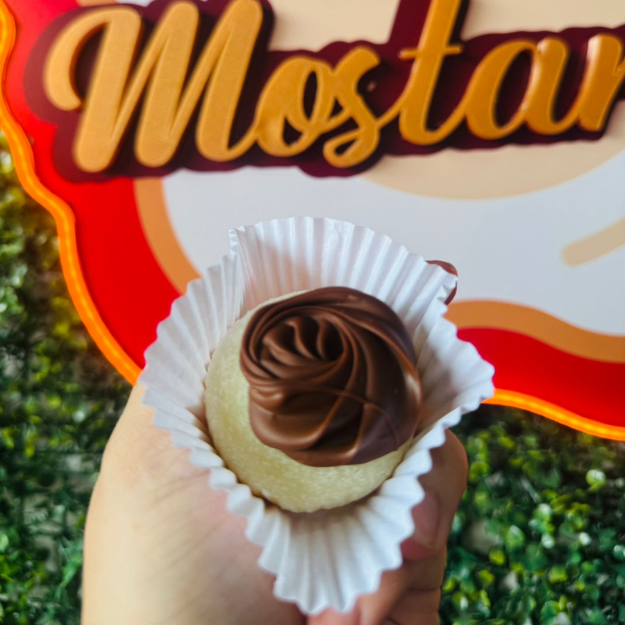 Bombom recheado com Brownie, Nutella, enrolado no brigadeiro de ninho finalizado com casquinha de chocolate nobre ao leite