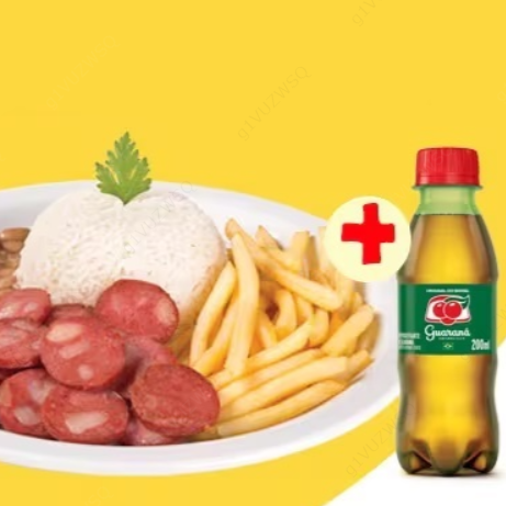 Linguiça calabresa fatiada (140g in natura) + arroz branco (220g) + feijão (130g/contém bacon) + batata frita + Refrigerante Caçulinha 200ml do seu sabor favorito.