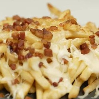 Batata frita, mussarela gratinada e bacon.