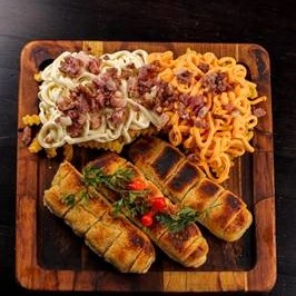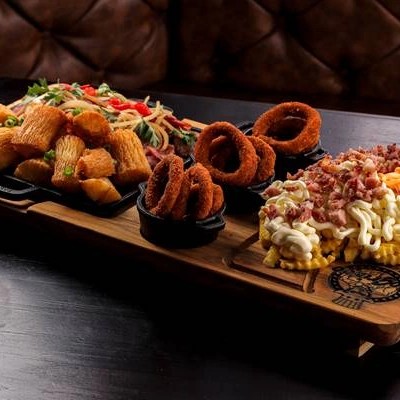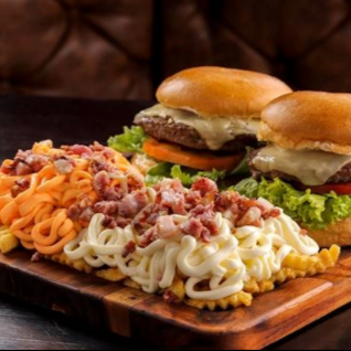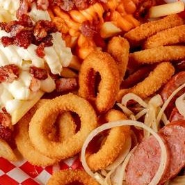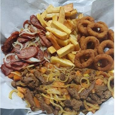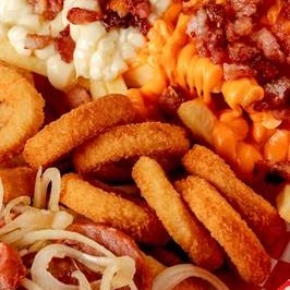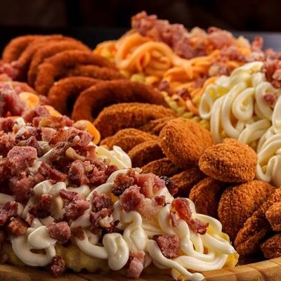 300g de Fritas Turbinada (cheddar, catupiry e bacon), 150g de Calabresa acebolada e 10 anéis de cebola.