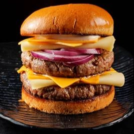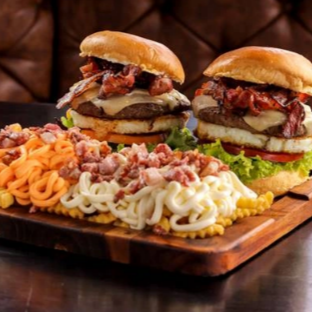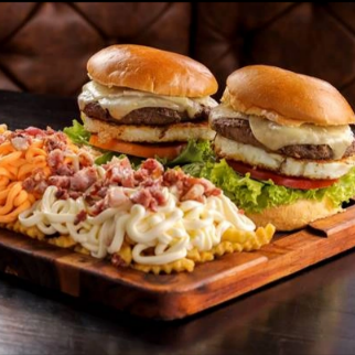Pão de brioche, cebola roxa, molho de alho, 2 hamburguer artesanal de 180g de pura suculência, queijo mussarela, queijo cheddar e molho especial da casa.