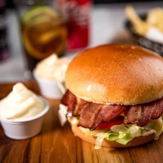 Pão brioche , maionese caseira, hambúrguer de fraldinha 120g,duas fatias de bacon defumado, alface e tomate,queijo prato.