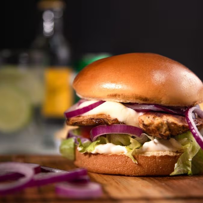 Pão de brioche, 180g de filé de frango grelhado, anéis de cebola roxa, Catupiry, alface, tomate e maionese caseira.