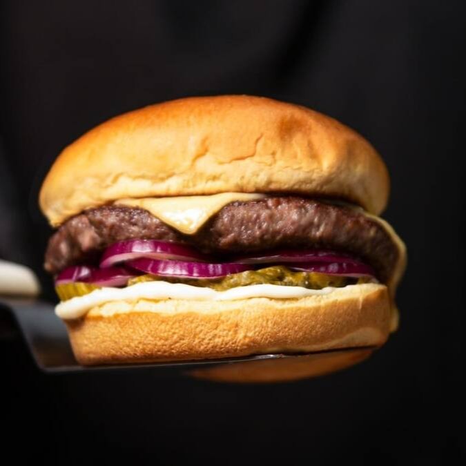 Pão de brioche, 180g de hambúrguer artesanal de fraldinha, queijo prato, Maionese caseira, picles e cebola roxa.