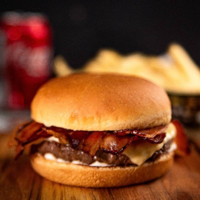 Pão brioche selado, hamburguer 120g de fraldinha,maionese caseira,duas fatias de bacon defumado, queijo cheddar.