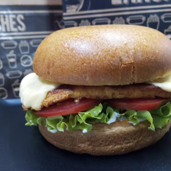 Pão Brioche, queijo prato,Maionese caseira, 180g de filé de frango grelhado,alface e tomate.