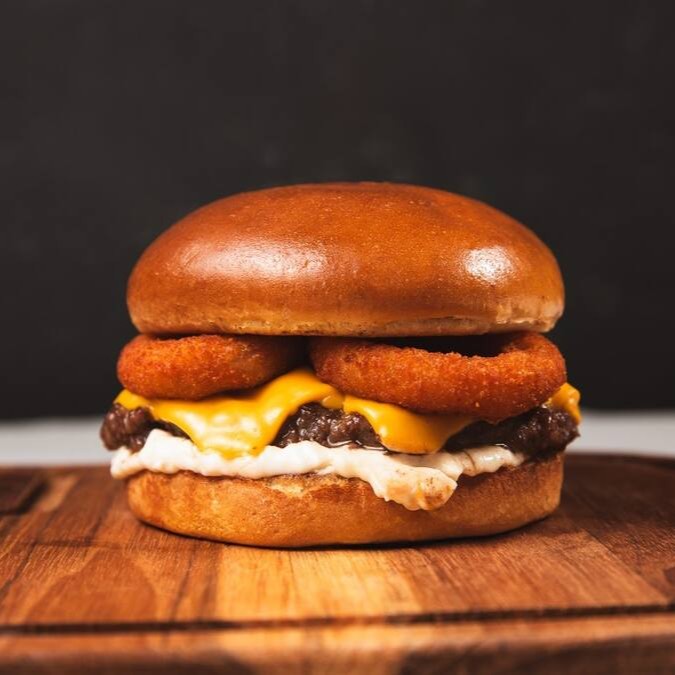Pão brioche, 3 fatias cheddar, 3 argolas de cebola empanada, maionese caseira e hambúrguer artesanal 120g.