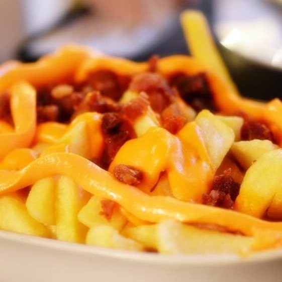 Batata frita palito,com cheddar cremoso,bacon em cubinhos 300g total.
