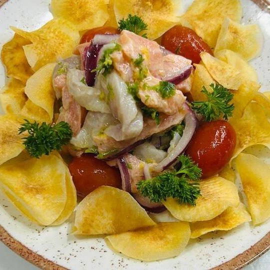Mix de salmão e tilapia marinado com molho especial acompanhado com chips crocante de mandioca(aprox. 300g)imagem ilustrativa.