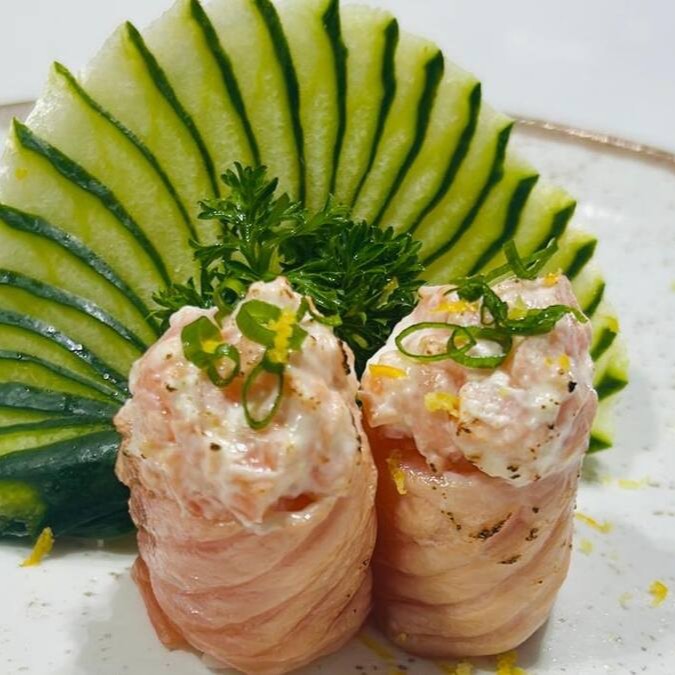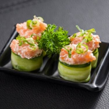 Joe enrolado em fatias finas de pepino com recheio de salmão completo cream cheese e cebolinha.