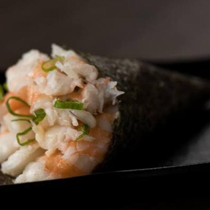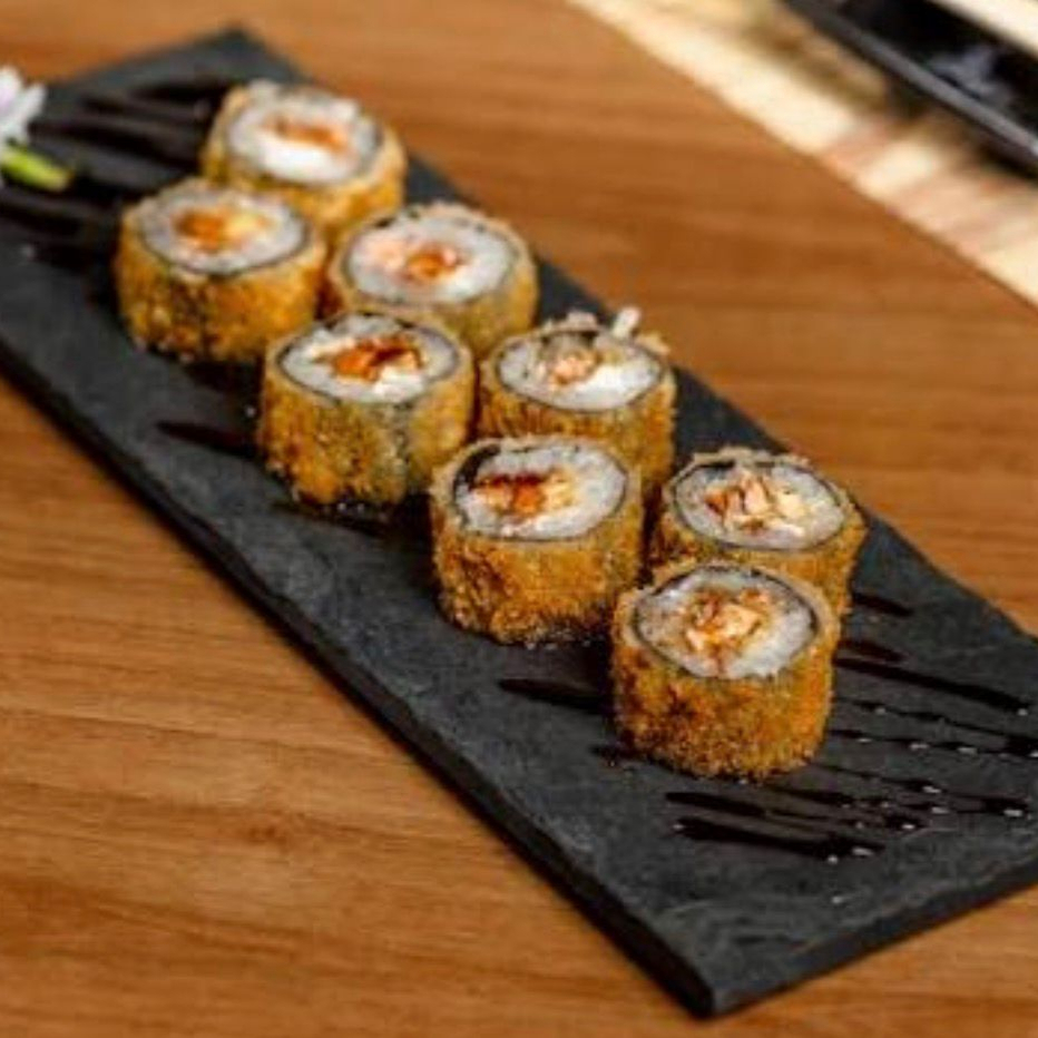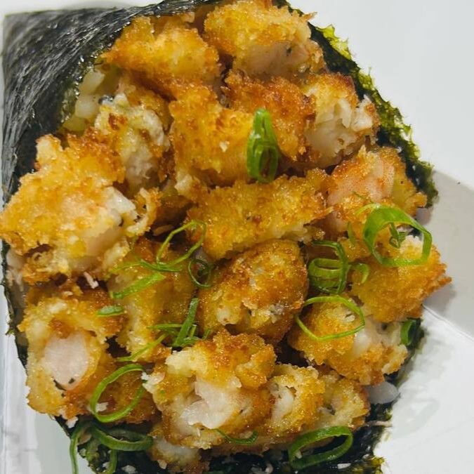 Temaki com o mais perfeito camarão à milanesa, de farinha panko, com cream cheese e cebolinha.