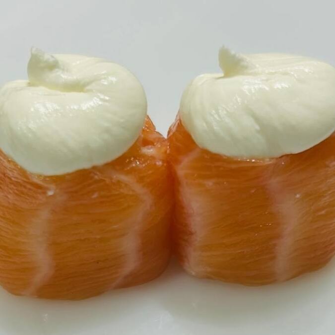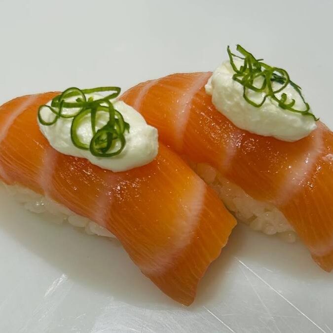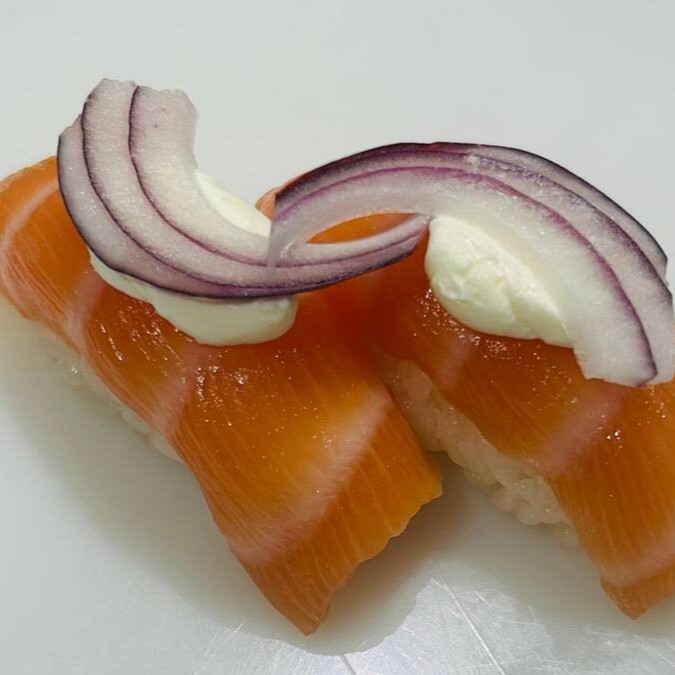 Niguiri de salmão com cream chesse e cebola roxa.