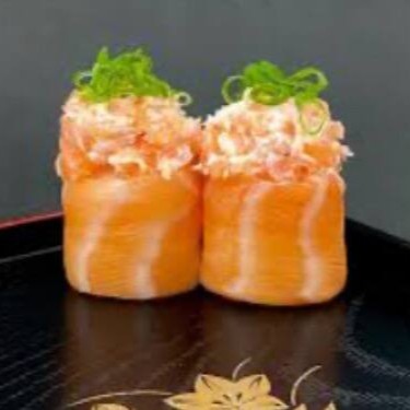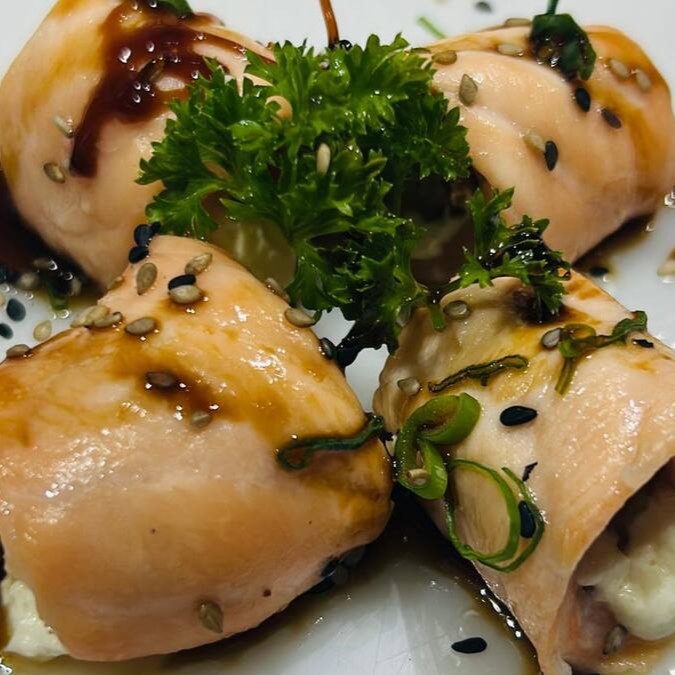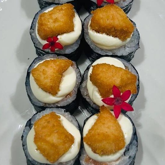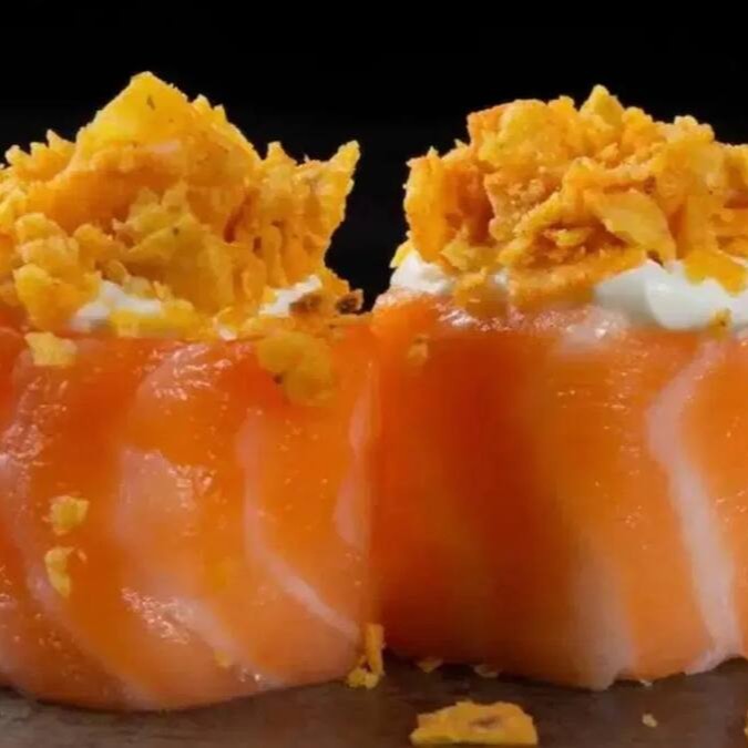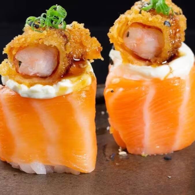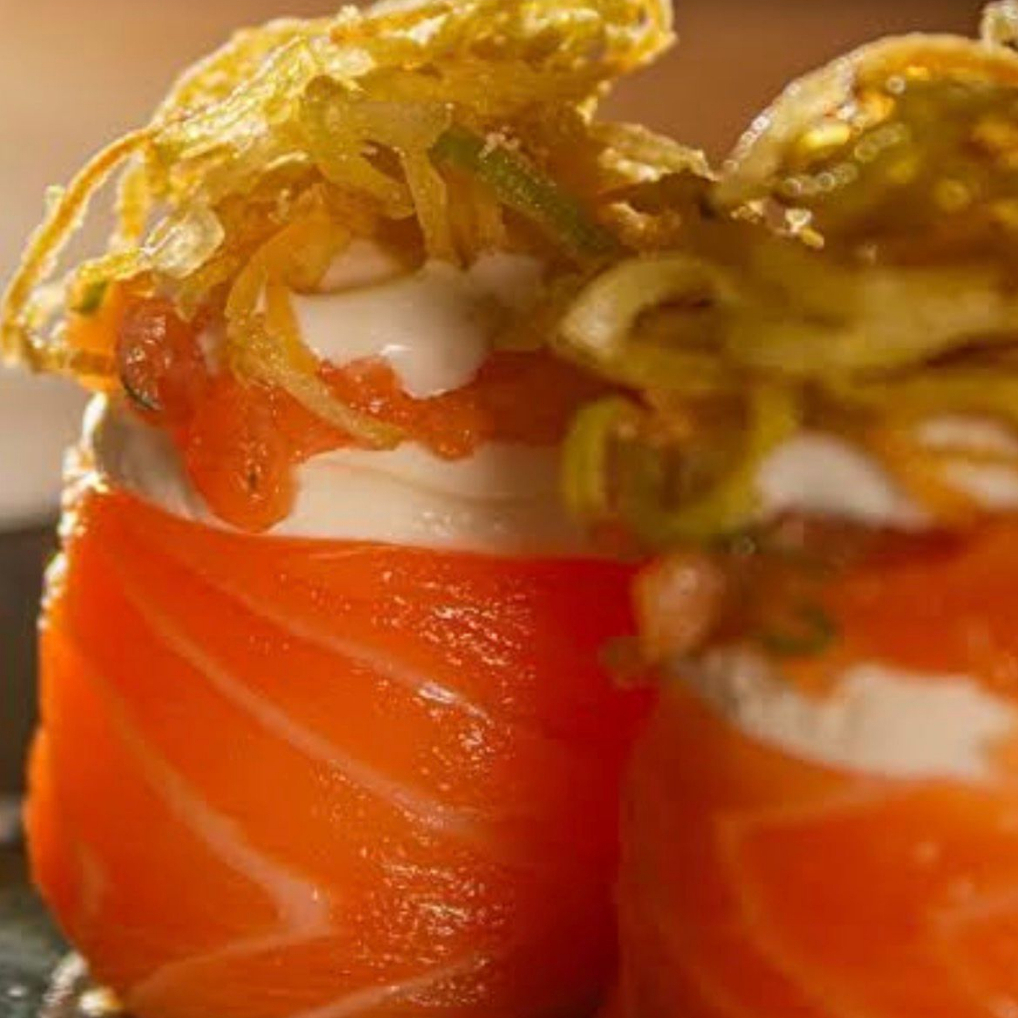 Enrolado com recheio de salmão com cobertura de cream chesse e cubinhos de salmão empanado