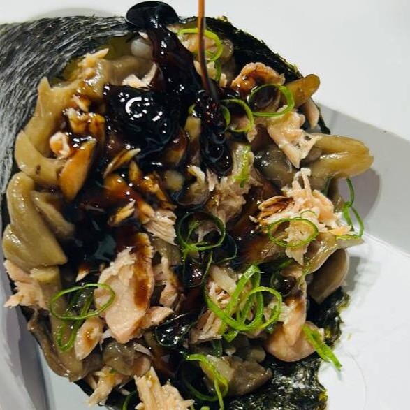 Temaki com o nosso maravilhoso shimeji na manteiga, finalizado com cream cheese e cebolinha.