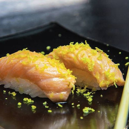 Niguiri de salmão levemente maçaricado, finalizado com azeite trufado, raspas de limão siciliano e flor de sal. 8 unidades.