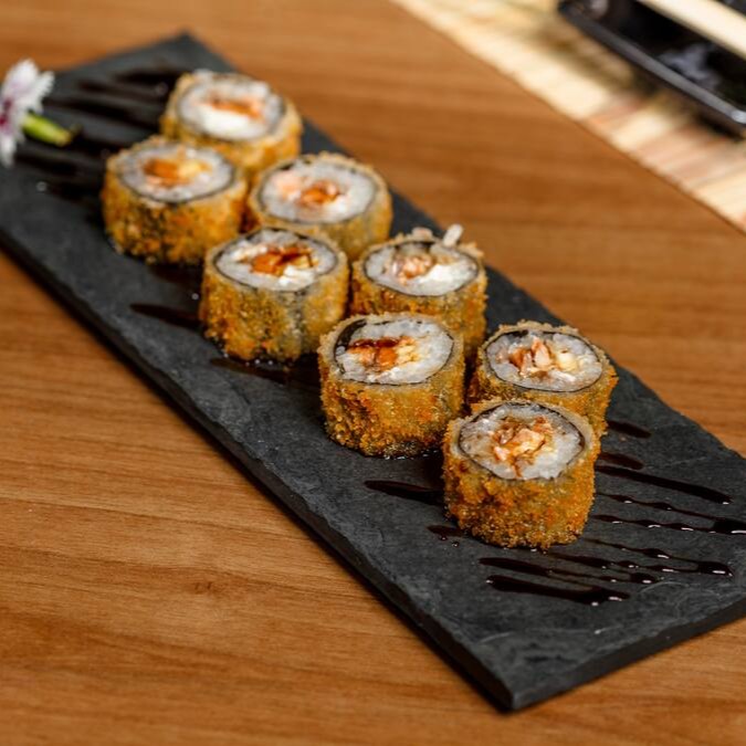 Enrolado de salmão com camarão empanado e cream chesse, flambado ao azeite finalizado com tarê, gergelim e cebolinha.(8 unidades)