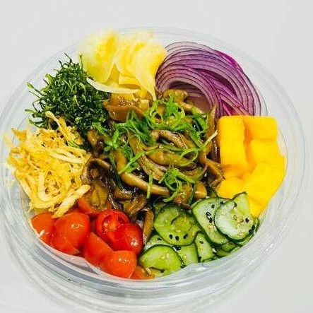 Uma combinação leve, colorida e cheia de sabor! Nosso poke traz o irresistível shimeji salteado, acompanhado de chips crocantes de mandioca, crispy de couve, crispy de alho-poró, tomatinhos cereja frescos, sunomono bem temperadinho, cubos suculentos de manga e delicadas fatias de cebola roxa.