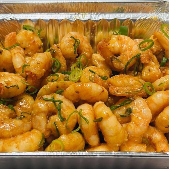 Camarões salteados na manteiga, levemente apimentado e finalizado com cebolinha .Aprox. 250 gr.