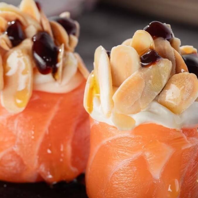 Joe salmão com cream chesse e amêndoas laminadas, finalizado com tarê.
