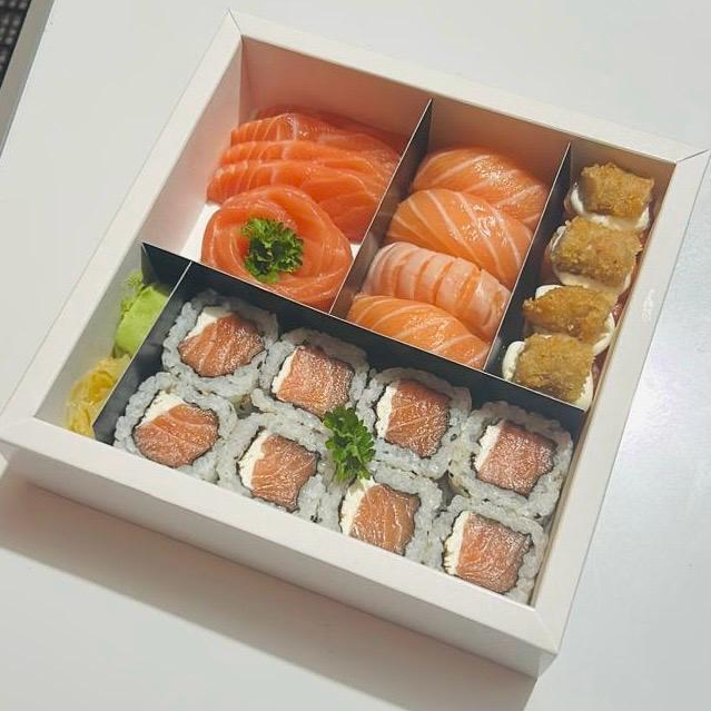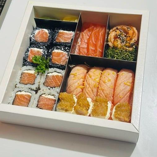 Combinado especial pensado para quem aprecia sabor e sofisticação. São 4 sashimis de salmão fresco, 4 sashimis de salmão maçaricado com geleia de pimenta e finalizado com gergelim, 4 niguiris de salmão maçaricado com raspas de limão siciliano e um toque de azeite trufado, 4 Joe Ebi, 4 uramakis tradicionais e 4 uramakis black. Uma experiência equilibrada, com contrastes de texturas e sabores que surpreendem a cada peça. ✨🍱