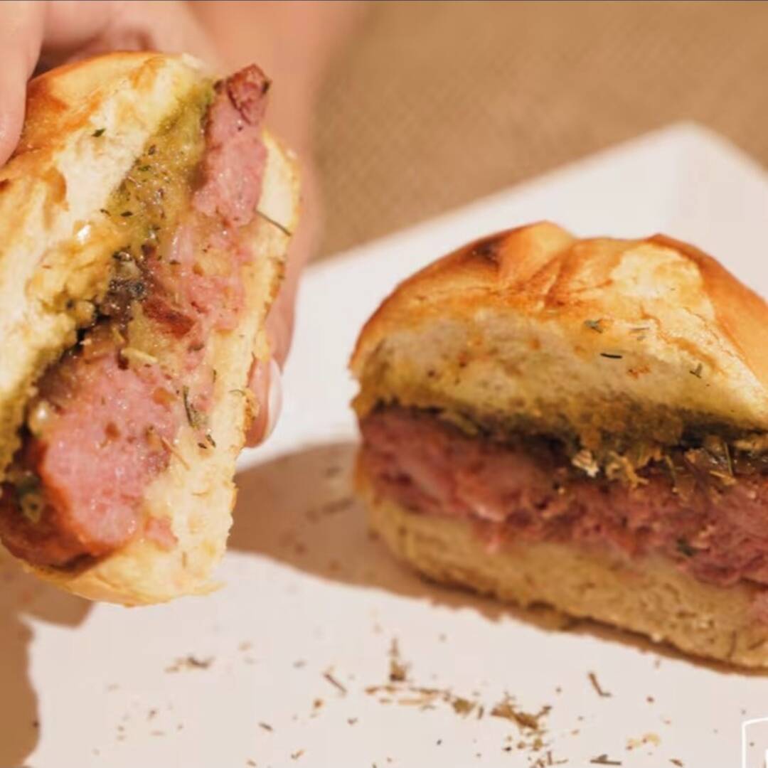 Pão bolinha, creme de provolone, cebola caramelizada, chimichurri, hambúrguer de linguiça toscana 235g