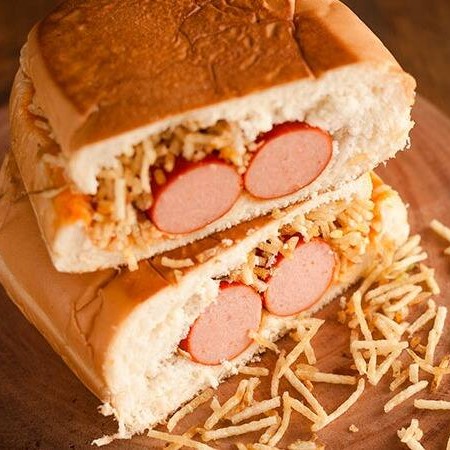 2 Salsicha chapeadas, queijo, ketchup, batata palha, tomate, ketchup e maionese no pão de hamburguer prensado.