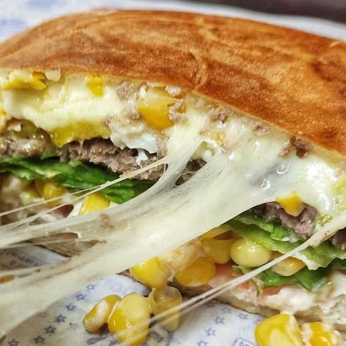 Hambúrguer de 130g, queijo, milho,batata palha, alface, tomate, ketchup e maionese no pão de hambúrguer.