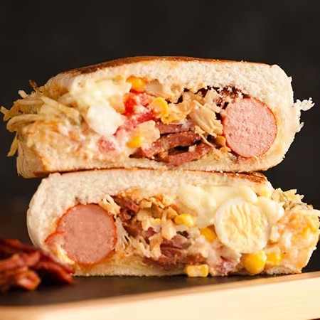 2 Salsichas chapeadas, queijo, bacon, Catupiry Original, milho, tomate, batata palha, ketchup e maionese no pão de hamburguer prensado.