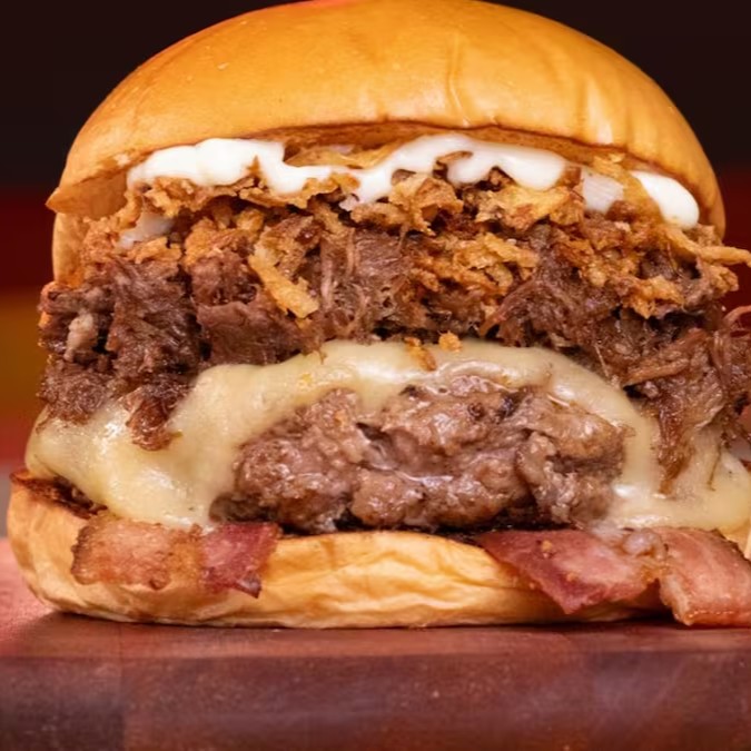 Pão de brioche, 2 hambúrguer artesanal de 130g, queijo, bacon, costela desfiada, cebola crispy e maionese.
