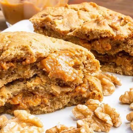 Cookie com pedaços de nozes e recheado com doce de leite cremoso artesanal
