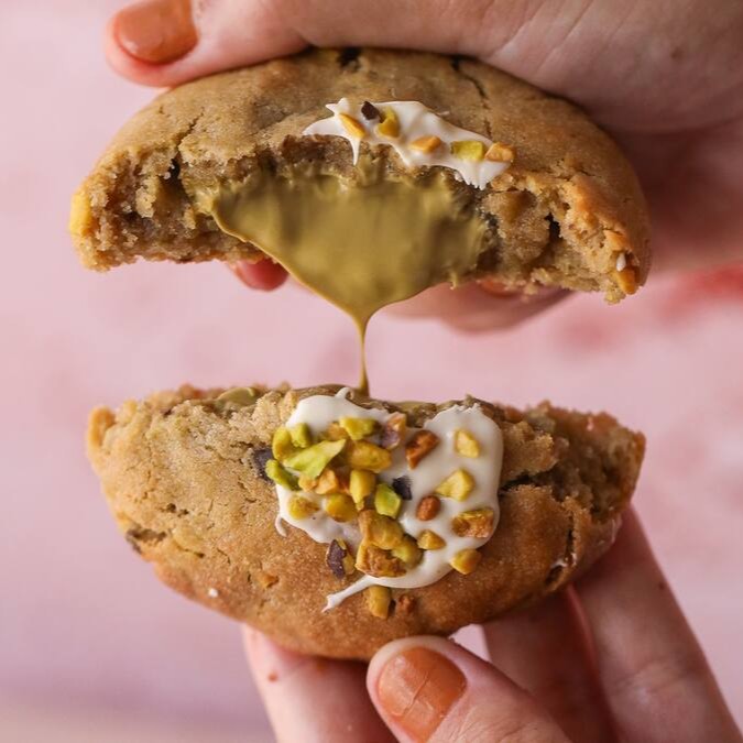 Cookie recheado com creme puro de pistache e chocolate branco