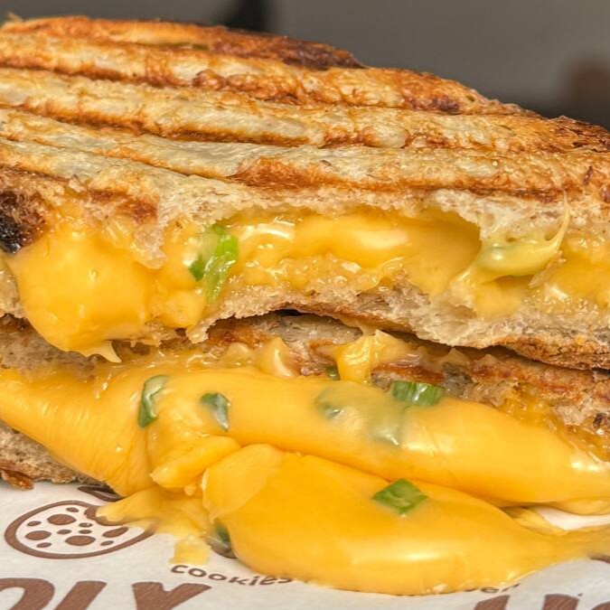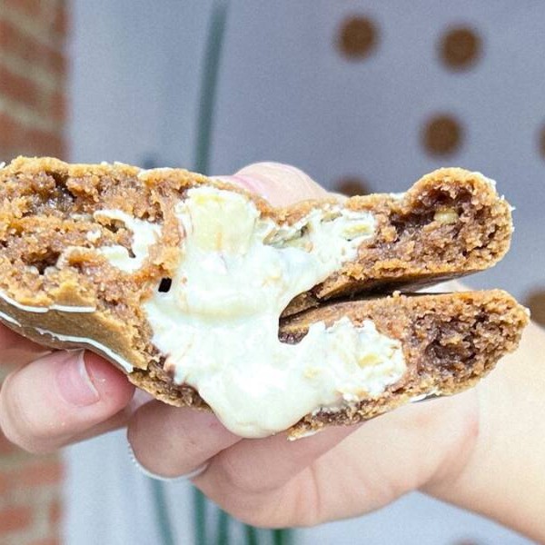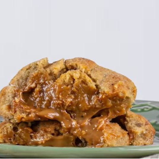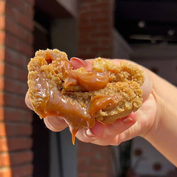 Cookie com recheio de doce de leite cremoso artesanal, finalizado com açúcar e canela!