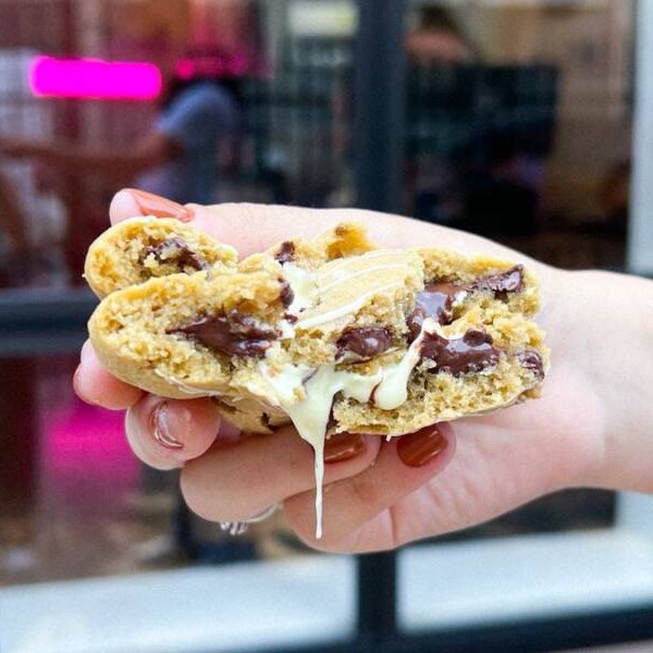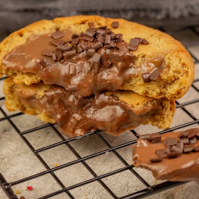 Cookie com pedaços de chocolate meio amargo e muito recheio de chocolate ao leite