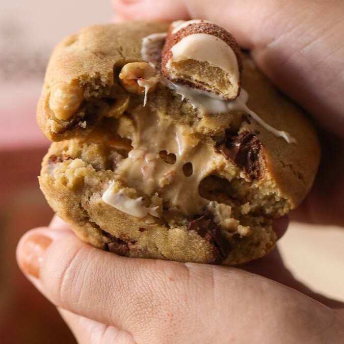 Cookie com pedaços de avelã, recheado com creme de avelã crocante e chocolate branco