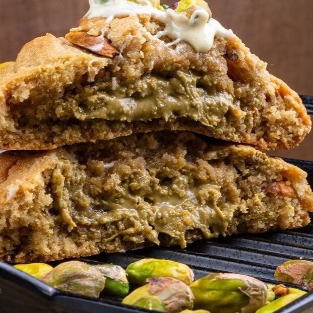 Cookie com pedaços de pistache recheado pasta pura de pistache e chocolate branco