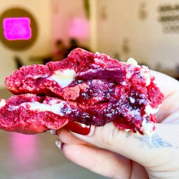 Delicioso cookie de Red Velvet com recheio cheesecake de frutas vermelhas