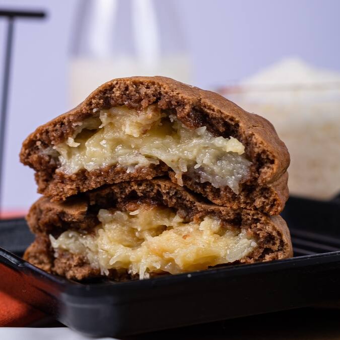 Cookie com massa de cacau e muito recheio de cocada cremosa