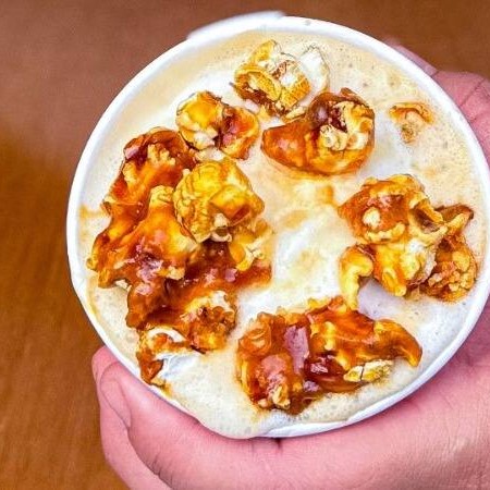 Sorvete de baunilha com pedaços de pipoca caramelizada artesanal