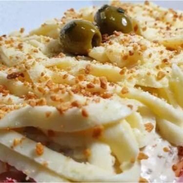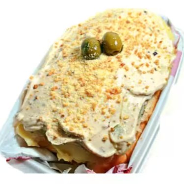 Dog montado na bandeja, 1 salsicha, ketchup e mostarda, milho, batata palha, Cream Cheese, Purê de Batata cremoso, deliciosa Maionese temperada, Farofa de alho frito, azeitona temperada
