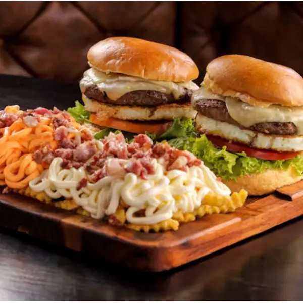 2 BURGUER SALADA, montado no pão de hambúrguer, maionese, catchup, batata palha, alface, tomate, um suculento hambúrguer, mussarela, presunto. Prensado na chapa, depois de montado. acompanha batata com bacon cheddar e catupiry
